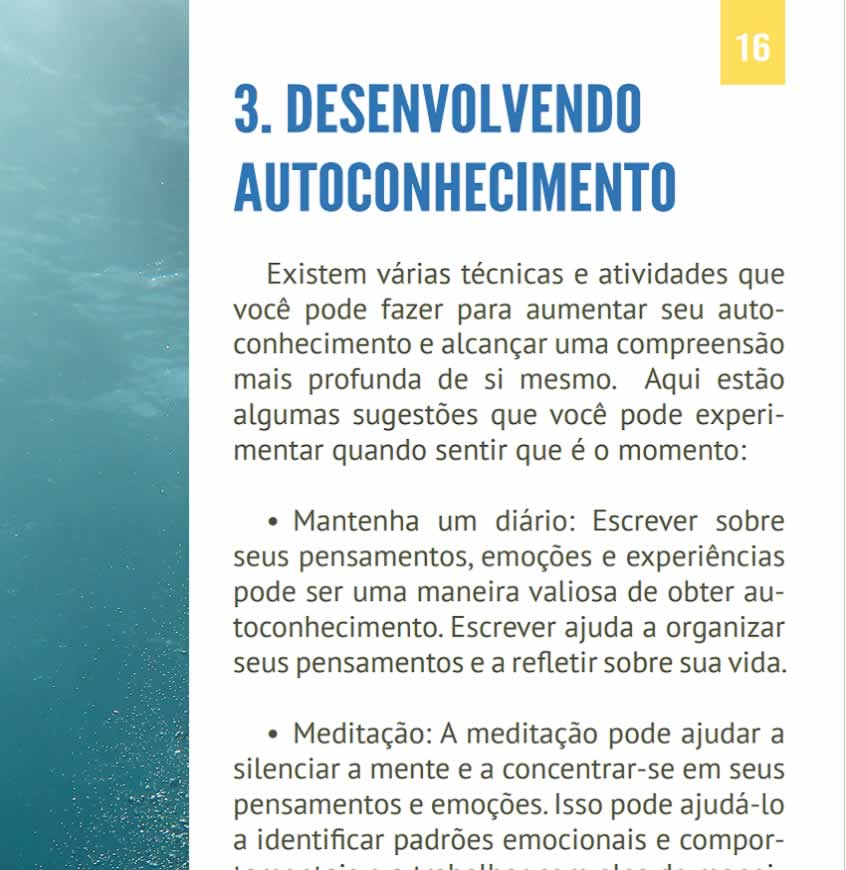 Você já parou para pensar em como seria a sua vida se você realmente se conhecesse? Se soubesse exatamente o que te motiva, quais são seus pontos fortes e onde precisa melhorar? O autoconhecimento é a chave para desbloquear todo o seu potencial e viver uma vida plena e satisfatória. Imagine tomar decisões com confiança e certeza. Quando você se conhece profundamente, cada escolha que faz está alinhada com seus valores e desejos. Não há mais dúvidas, apenas clareza e segurança para seguir em frente. Quer crescer e se desenvolver continuamente? O autoconhecimento é o primeiro passo. Ele te mostra onde você pode melhorar e te motiva a buscar o crescimento constante, transformando sonhos em realidade.